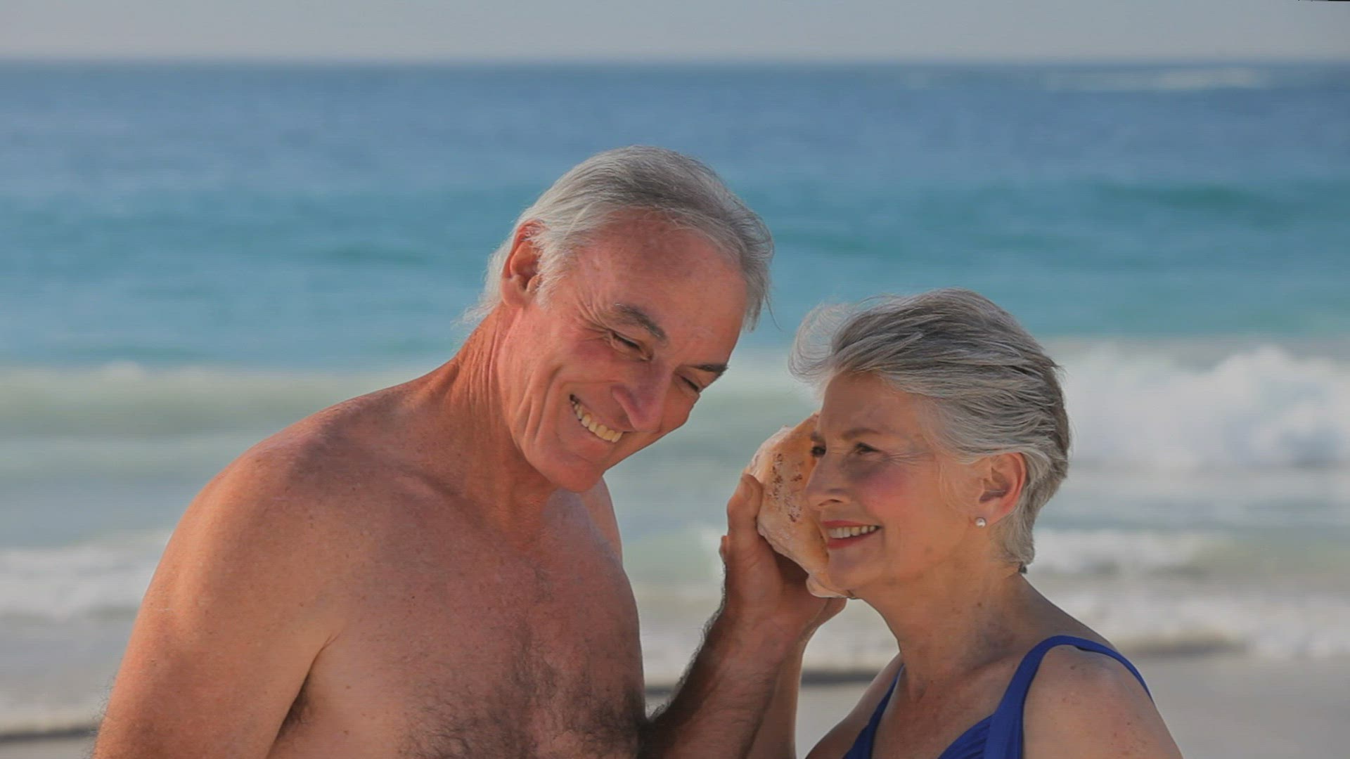 Beautiful girl listens to a shell. She put the shell to her ear and listens to her. It stands on a white background smiling and enjoying.