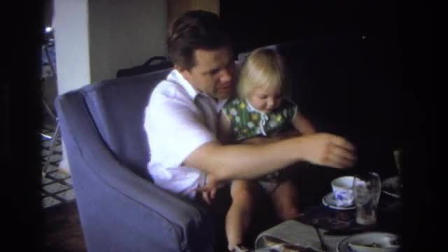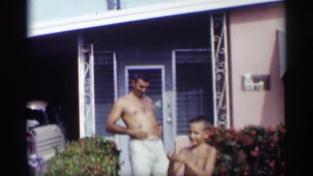 727668 - 1959: father and child having fun together while the father shows off his stomach. CALIFORNIA