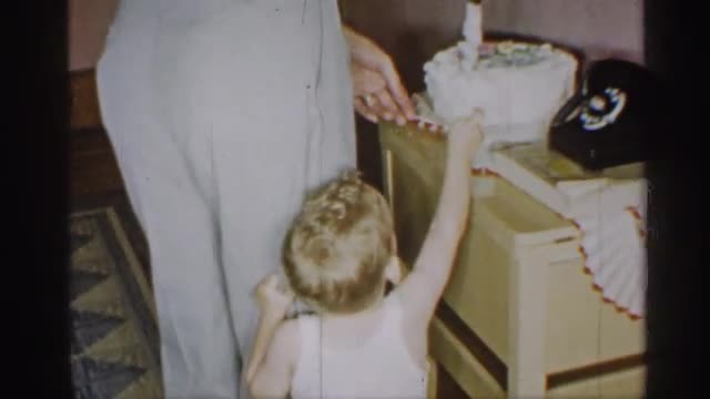 725381 - 1955: a kid and her father at their home and the father made a cake to cut for her daughter. NEW YOR