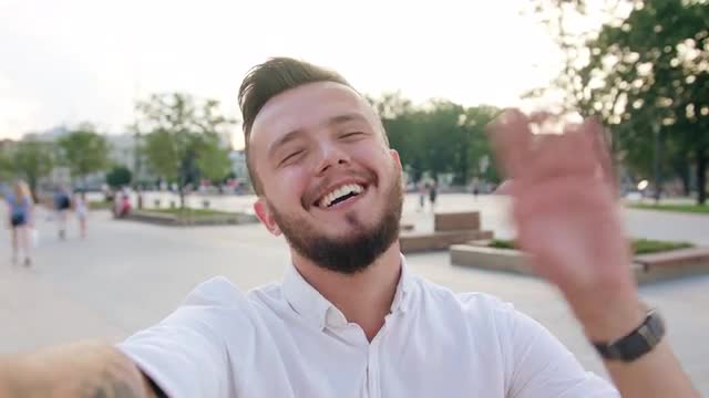 > Handsome guy smiles and waves hello. The guy is very nice and amazing.