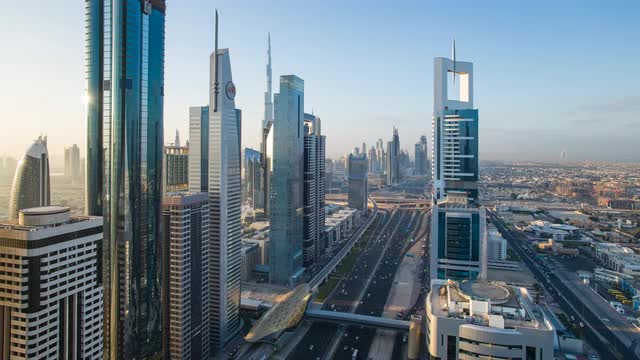 United Arab Emirates, Dubai, Sheikh Zayed Rd, traffic and new high rise buildings along Dubai's main road - time lapse