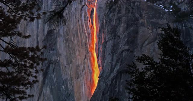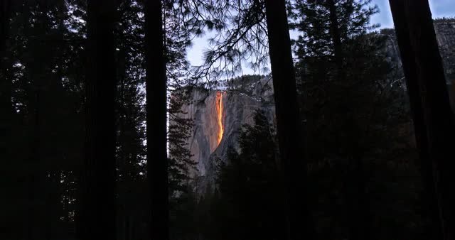 Long shot of the Fire Falls in Yosemite Valley of Horsetail Falls.