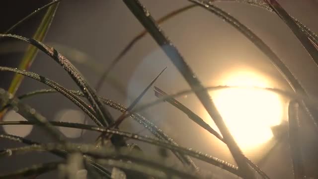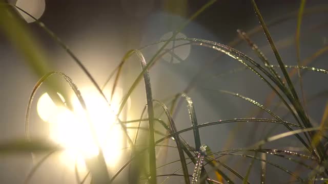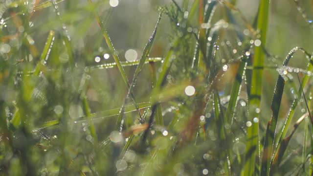 Dew on the Grass Leaves in Sunlight, Close-Drops, Glare, Background Bokeh
