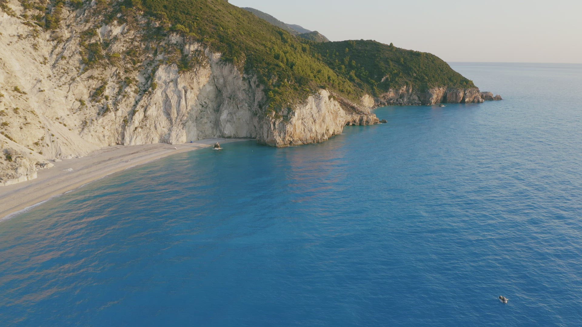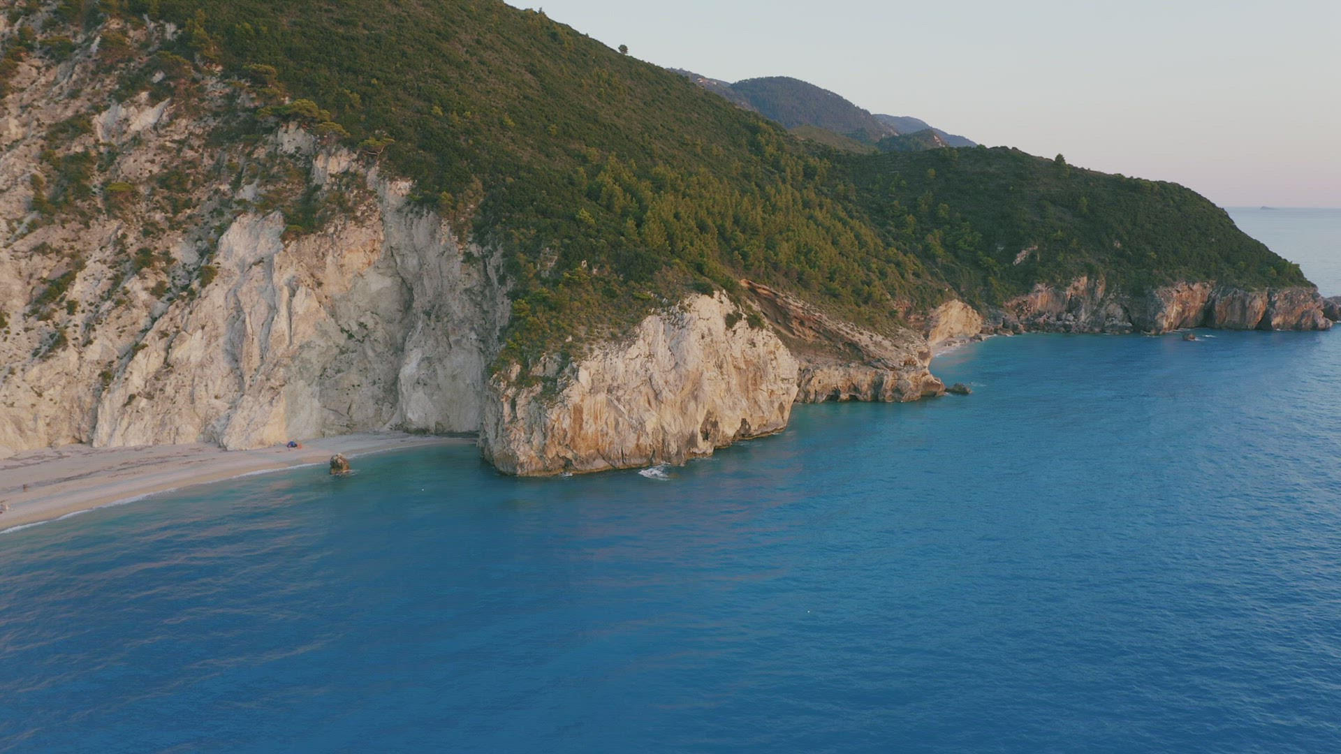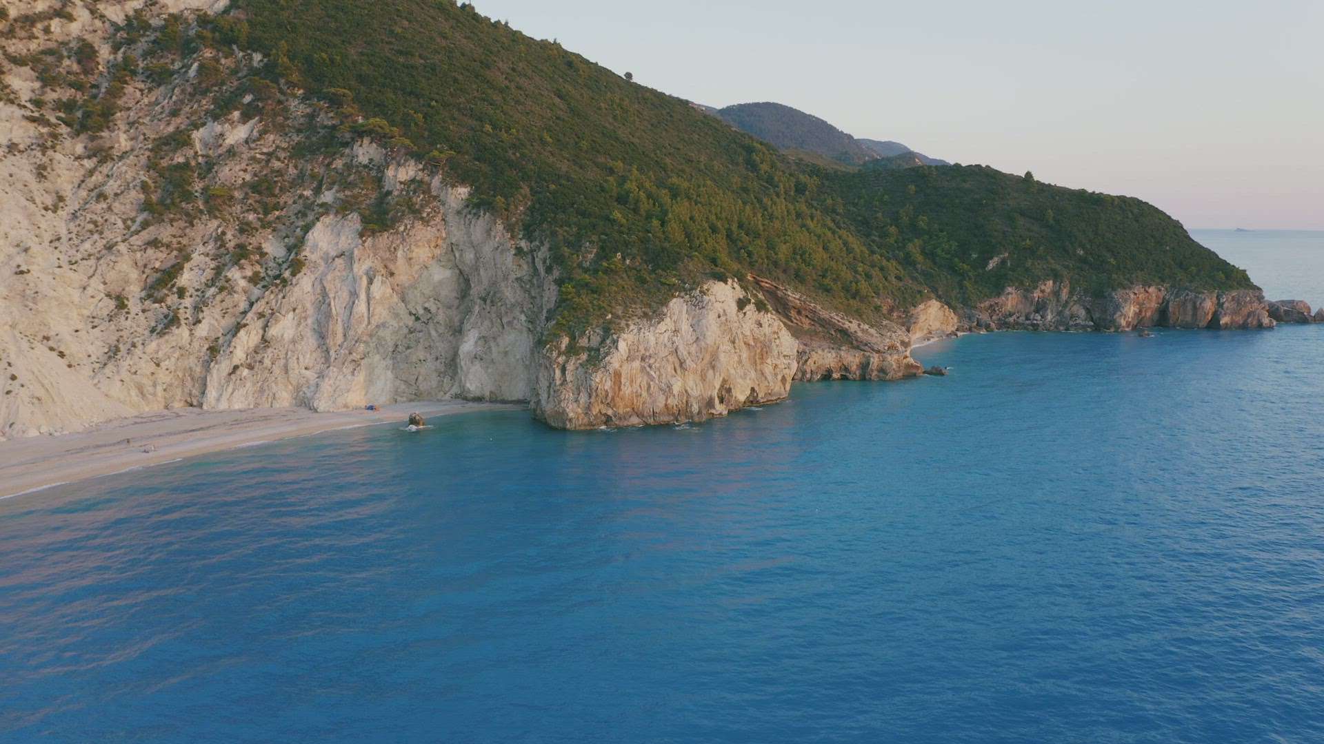 2166374 - Aerial coast revealingn footage of beautiful Milos beach of Lefkada, Ionian island, Greece. Sunset g