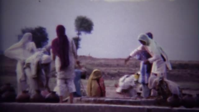 > 1973: Arab women water well primitive clay pot vessels.