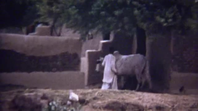 > 1973: Arab boy herding cow rural farm dry desert middle east.