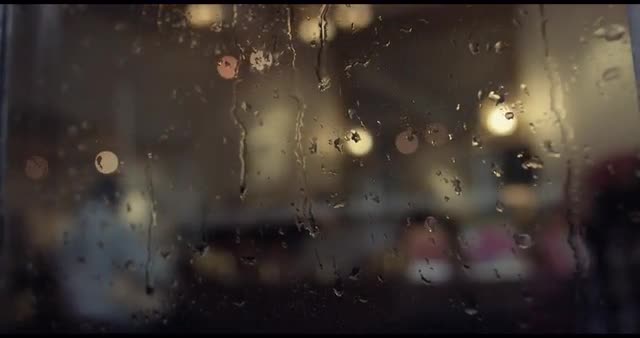 Water droplets fall down a window, which looks into a cafe, bokeh in background.