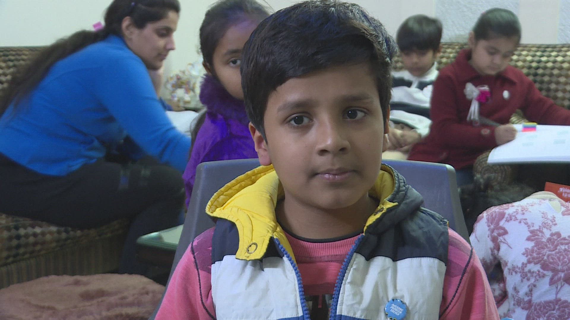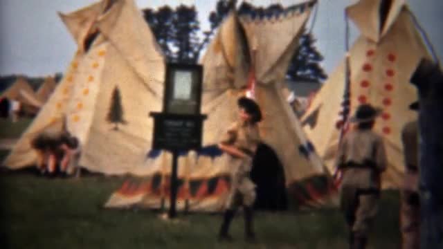 > 1963: Kids native american indian dancing colorful ancient costume.
