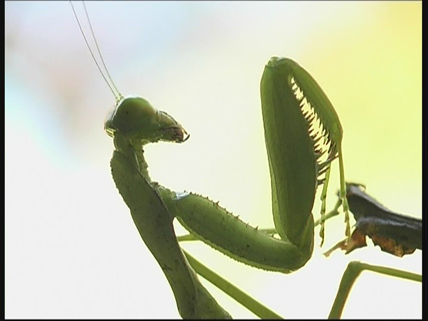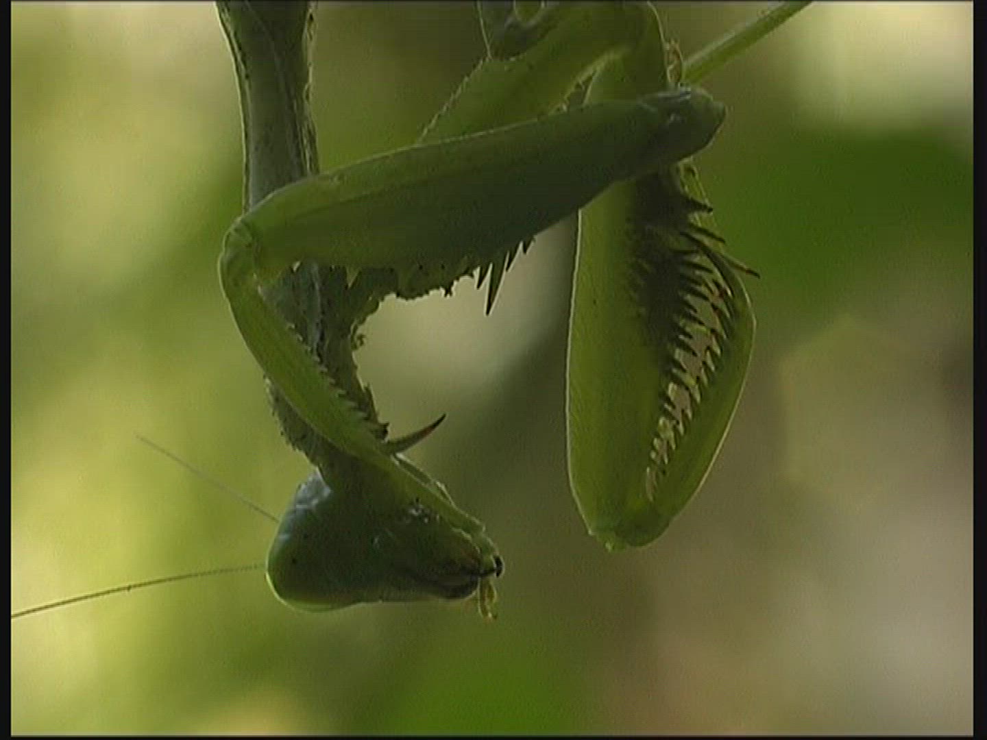 Mantis is Climbing up Insect's Backside on Violet Leaf Plant Leaves European Mantis Praying Mant