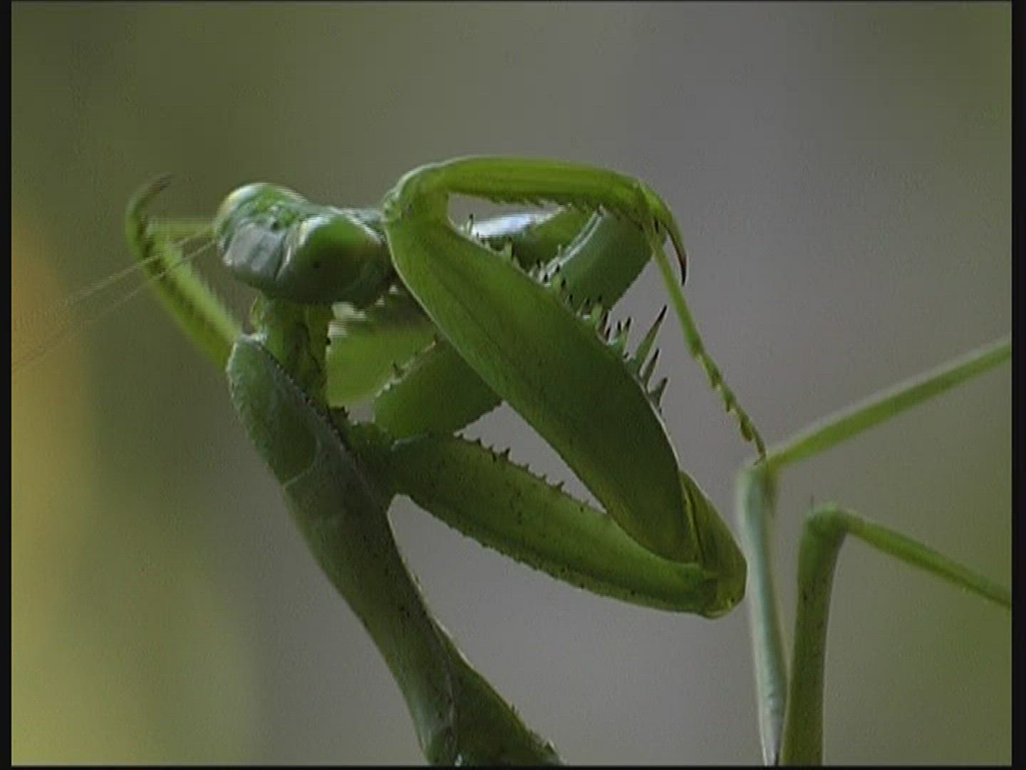 > Mantis is Climbing up Insect's Backside on Violet Leaf Plant Leaves European Mantis Praying Mant