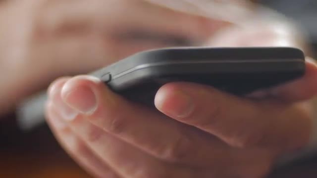 Man's Hands Using Smart Phone in Winter Against Beautiful Sunset