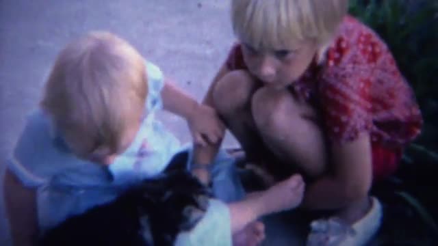 > 1961: Baby playing with kitten cat on sidewalk practice petting.