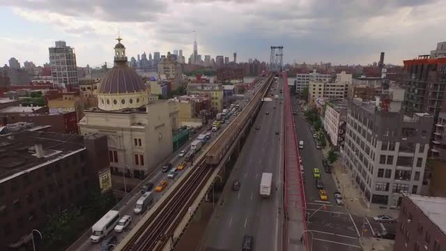 > Aerial shot of traffic in Brooklyn, New York, United States