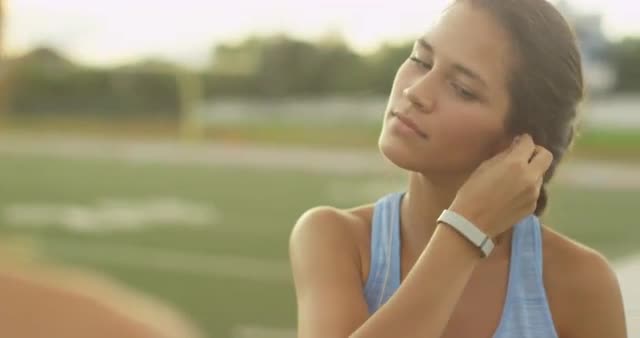 460030 - Athlete grabbing earbuds in gymnasium