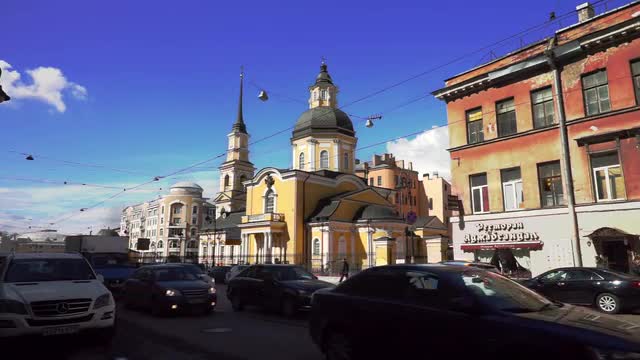 St.petersburg/russia - May 03 2014: Cityscape With Day Traffic Near Saint Simeon and Anna Church and Restaurant Adgabsandal Under Blue Sky.