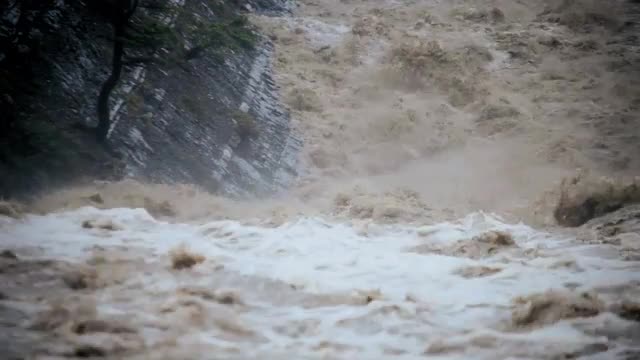 Close up view swollen river flood waters boiling creating damage environmentally, USA