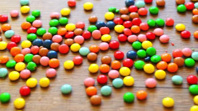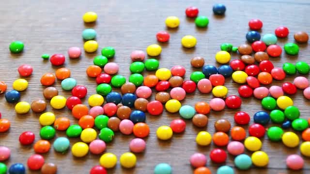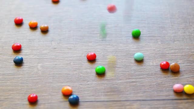 Colorful Candies Bouncing Off the Wooden Table Surface