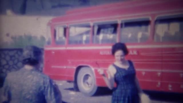 > 1963: Italian woman grandma wait red tour bus travel sightseeing.