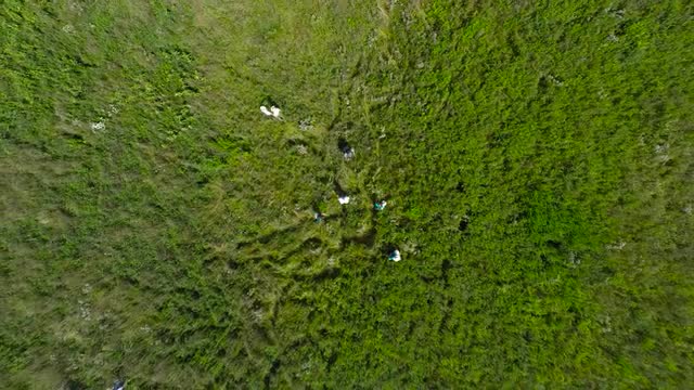 Ascending overhead shot of people catching bees in a vibrant green field