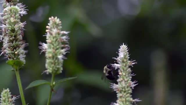 A bumble bee climbs and feeds on Hyssop flower stem