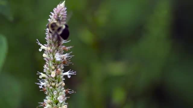 A bumble bee flies around the top of a Hyssop flower stem and then takes off out of frame