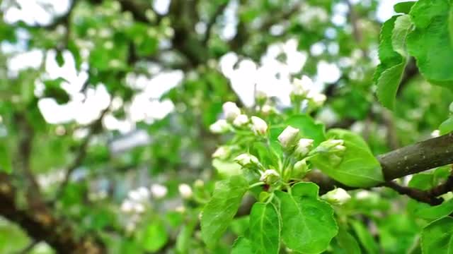 673054 - Flowering Apple Macro Sunlight Into Florets. Background Blurred Green Spots Bokeh