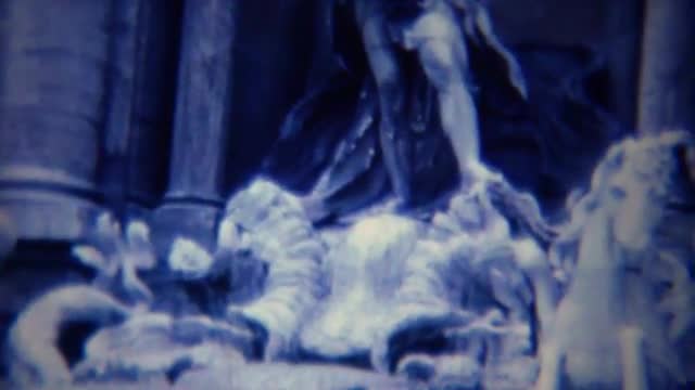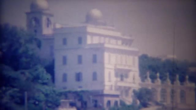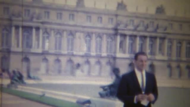 > 1963: Italian man visits stately palace grounds dressed to kill.