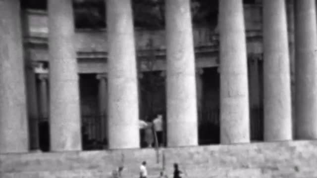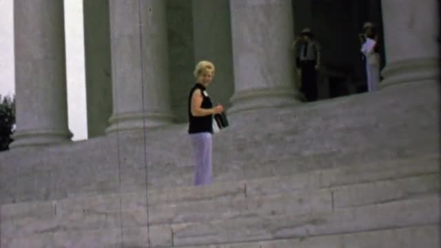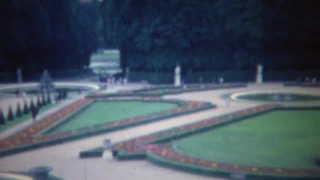 > 1963: Women visits Roman Italian wealthy manicured garden grounds.