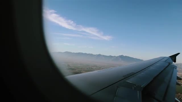 Aerial footage of a plane wing with a mountain landscape background.