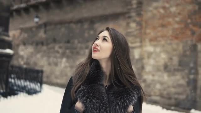 498319 - Cinematic shot of girl walking through forest while snowing