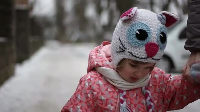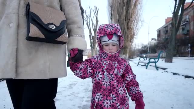 696448 - 3 Year Old Girl Walking With Her Mother by Snow-Covered Embankment Alley in Winter . Steadicam Shot