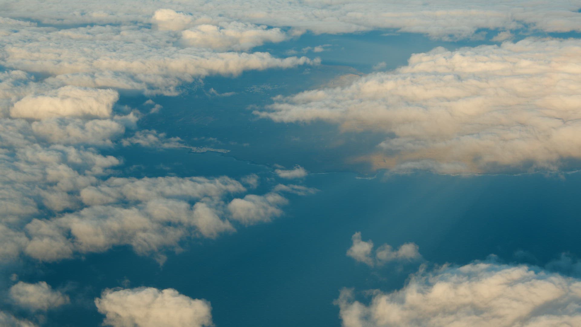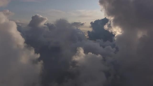 Aerial footage of fluffy clouds, blue sky