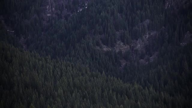 Static shot of green forest on hillside.