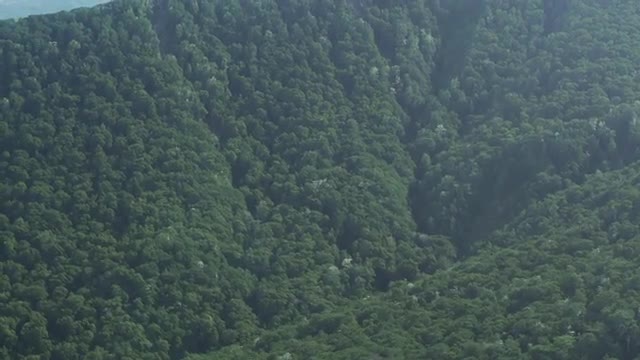 Showing aerial footage over mountain forest