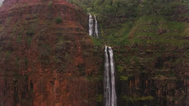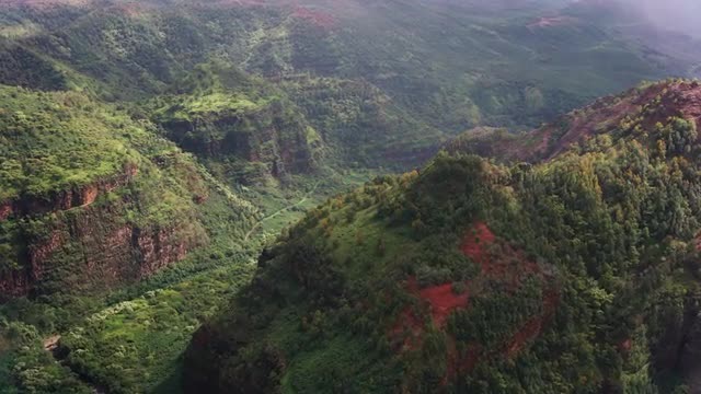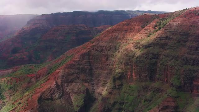Sunrise time lapse on a misty morning at Waimea Canyon, Kauai, Hawaii, with wind blown clouds and red and pink sun rays.