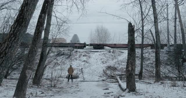 > Red Electric Train Blue Freight Train Railroad Tracks and Contact Network Traffic Lights Rainy Autum