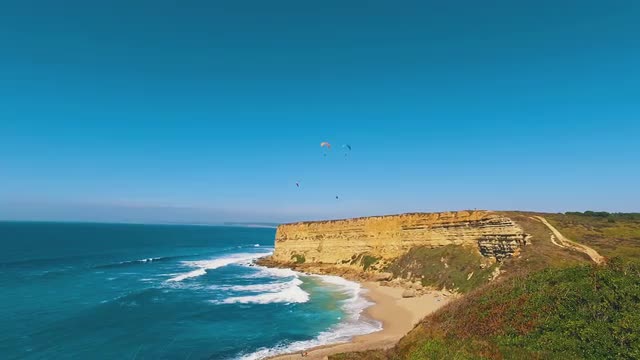 Paragliders Fly Over the Ocean Beach, sunny day