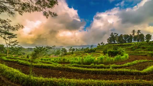 Sunset and clouds over rice terraces in Bali, Indonesia