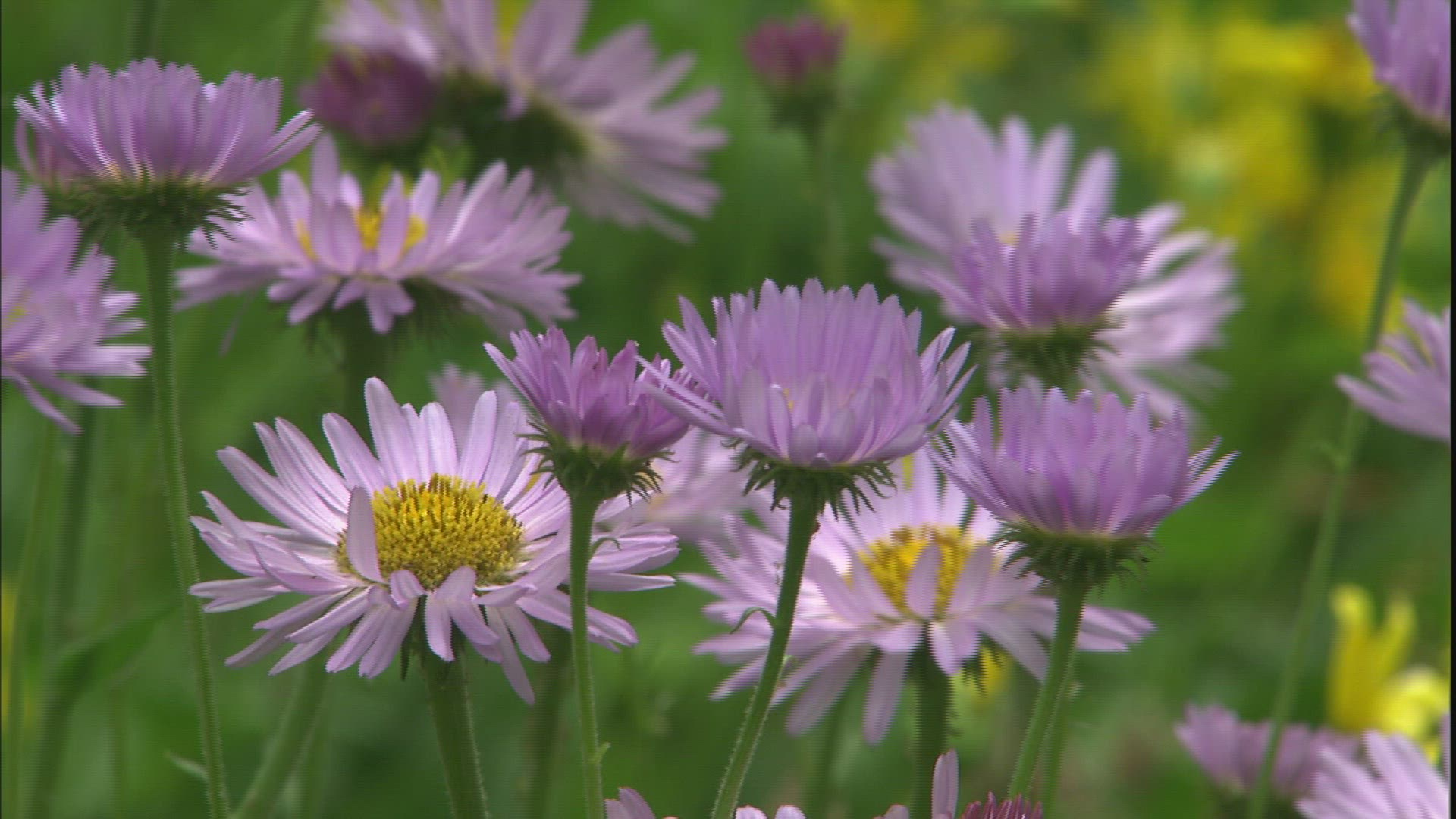 > Pastel Violet Aster Flowers on Green Meadow