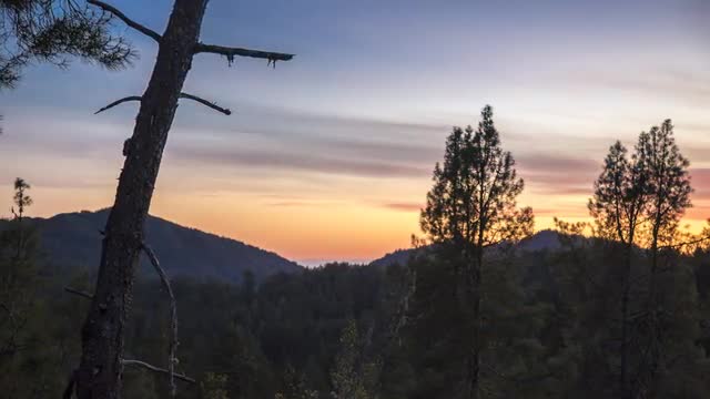 The camera moves past trees, looking out over a mountain forest towards a setting sun.
