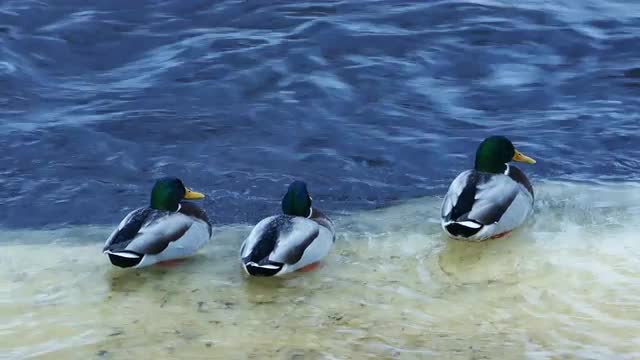 Flock of Ducks Hunting at Lososinka River Surface With Drifting Ice, Karelia, 4k Ultra hd Stabilized Shot