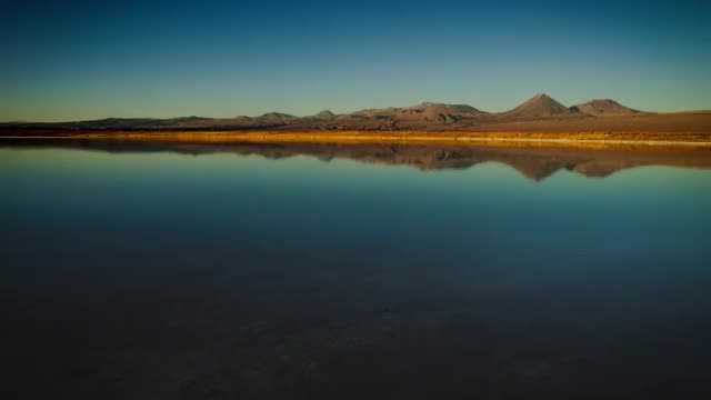 Motion controlled dolly shot from Laguna Cejar of the sun set sweeping over Licancabur volcano and the surrounding mountains. San Pedro de Atacama - Chile.