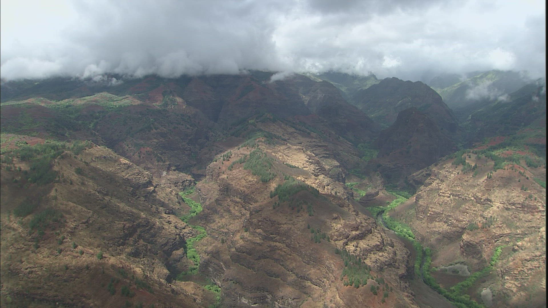 A panning shot on a rare and beautiful sunning day at the top of the Waimea Canyon overlook at the top of the west side of Kauai.