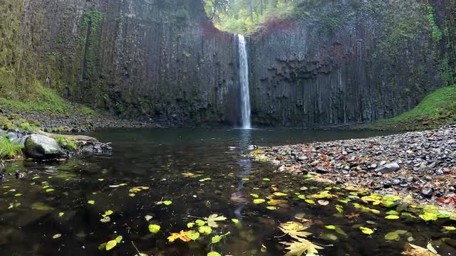 Wide shot of Abiqua Falls with Fall leaves flowing in the pool. Surrounded by cliffs in the Oregon Forest.