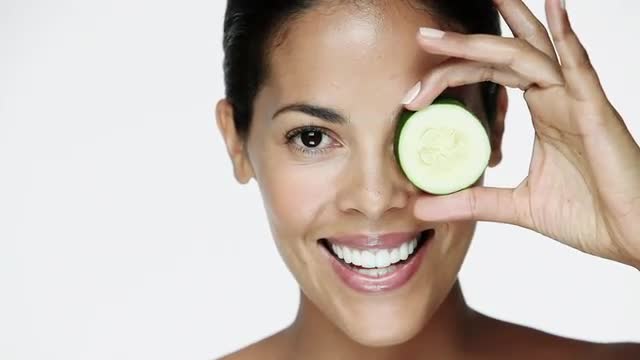 > Young woman holding cucumber slices over eyes