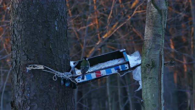 Titmouse Bird (Parus Major) Eating From Feeder in Winter Forest, Shot in 4k Ultra Hd, Footage Can be Downsized or Cropped Without Quality Loss
