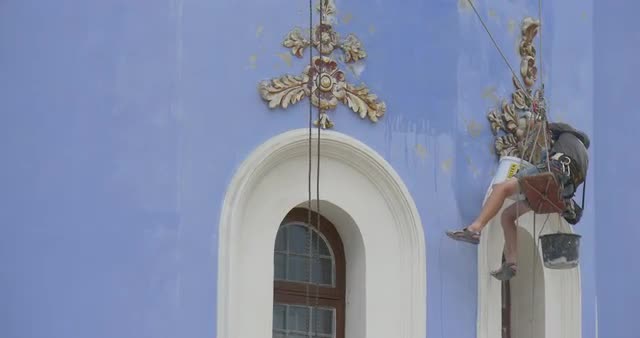 507566 - Restorer, Man, Industrial Climber, is Holding on a Rope, Paint in a Buckets, Painting the Wall, Grin