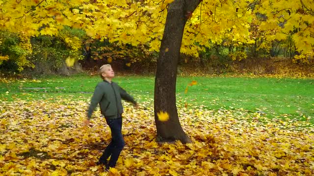 Little Girl's Silhouette in Beret and Blue Jacket is Standing at Maple Tree, Girl is Holding a Bouquet of Maple Leaves, Talking, Turning Toward Camera, Girl's Face, Sunset, Bright Sun Rays, Houses on a Horizon, Silhouettes, Buildings, Yellow Maple Leaves, Fallen Dry Leaves Under Trees in Park Alley in Fall, Autumn, Outdoors