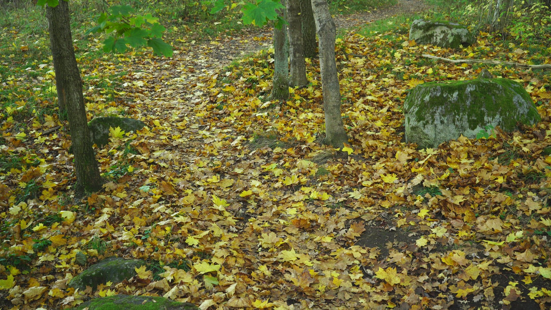 Little Girl in Beret and Blue Jacket and Red Scarf is Picking the Red Leaves From Small Tree, Making a Bouquet, Girl's Silhouette, Sunset, Sun Rays, Fallen Leaves on the Ground, Buildings on a Horizon, Silhouettes, Yellow Maple Leaves, Fallen Dry Leaves Under Trees in Park Alley in Fall, Autumn, Outdoors