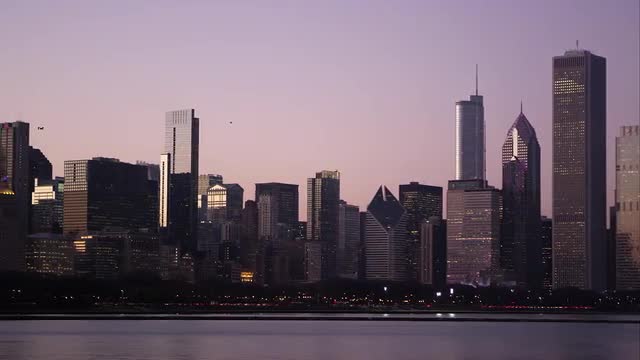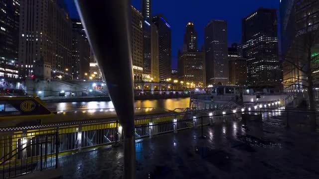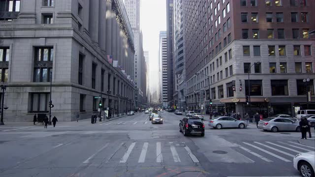 Traffic and pedestrians on a downtown Chicago street.